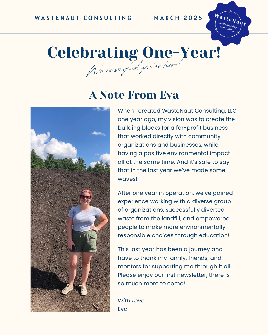“WasteNaut Consulting is critical to our organization achieving our sustainability goals! Eva and the team are incredibly knowledgeable, well practiced and deeply respected regionally in all matters of sustainability consulting. Working closely with our organization, WasteNaut has empowered our zero waste operations and supported our capacity to grow our landfill diversion rate year over year. Partnering with WasteNaut has been transformative to our work!”