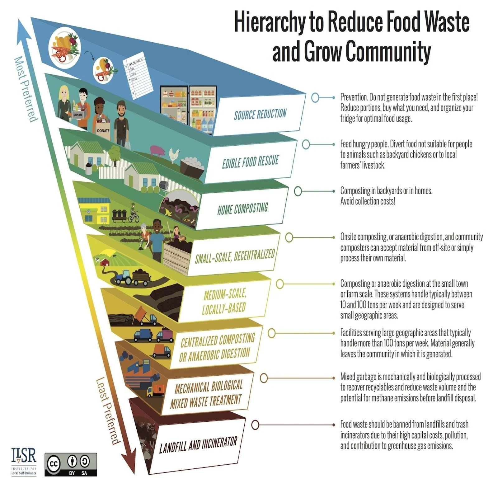 At the very top of the hierarchy is prevention. The best way to deal with waste is simply not to create it in the first place! From there, the hierarchy moves toward strategies like donating edible food, composting at home, and developing locally prioritized composting systems.